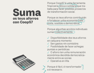 Para seguir dando impulso a proxectos únicos, necesarios e transformadores, Coop57 pon en marcha esta campaña co obxectivo de equilibrar o crecemento dos recursos económicos. O gran reto consiste en que as persoas e entidades que xa somos socias aumentemos os nosos aforros con Coop57 e, tamén, apoiar a Coop57 a sumar…